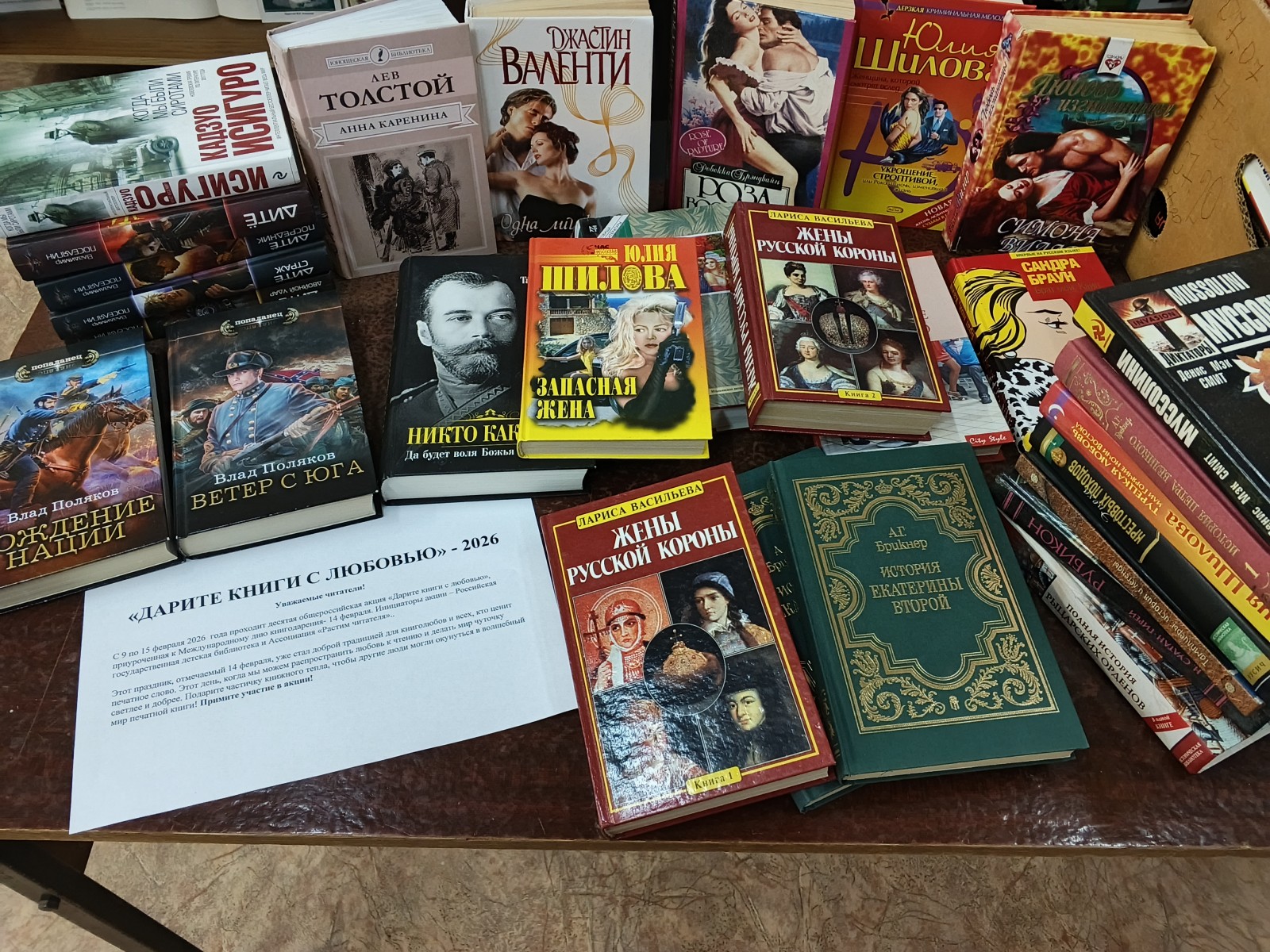 С 9 по 15 февраля прошла десятая общероссийская акция «Дарите книги с любовью», приуроченная к Международному дню книгодарения – 14 февраля.Инициаторы акции – Российская государственная детская библиотека и Ассоциация «Растим читателя» – проводят её при поддержке Минкультуры России, Российского книжного союза и Ассоциации книгораспространителей.