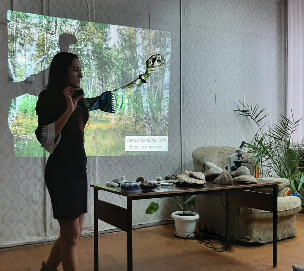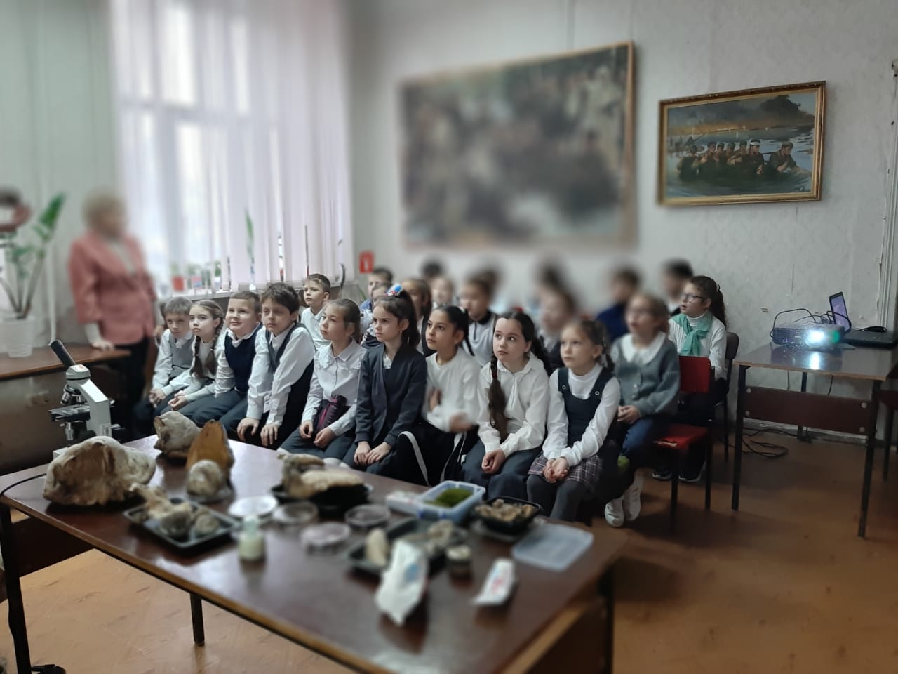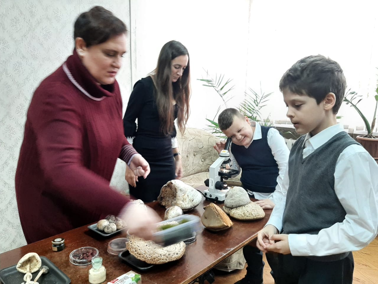 Детям было предложено детально рассмотреть, потрогать и даже понюхать представленные экспонаты (мох, различные грибы). Наибольший восторг на ребят произвел микроскоп, в котором можно было рассмотреть не видимые невооруженным взглядом бактерии.В заключение мероприятия Вероника Валерьевна прочла стихотворение о матери потерявшей в годы Великой Отечественной войны сына. Присутствовало 27 учащихся гимназии № 9 из 2 «Б» класса.